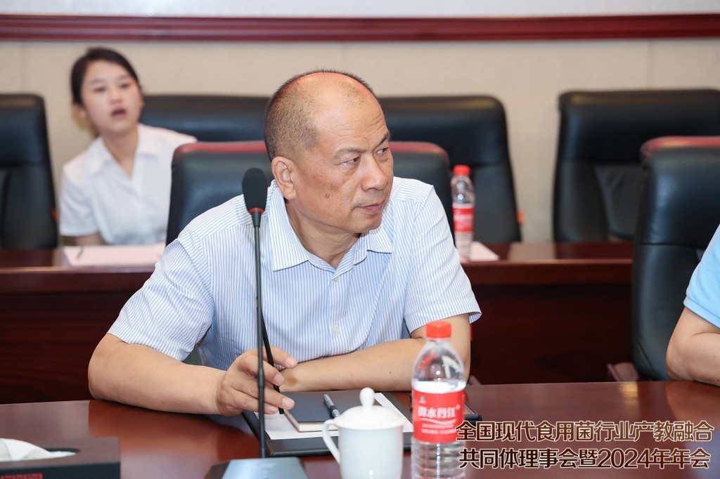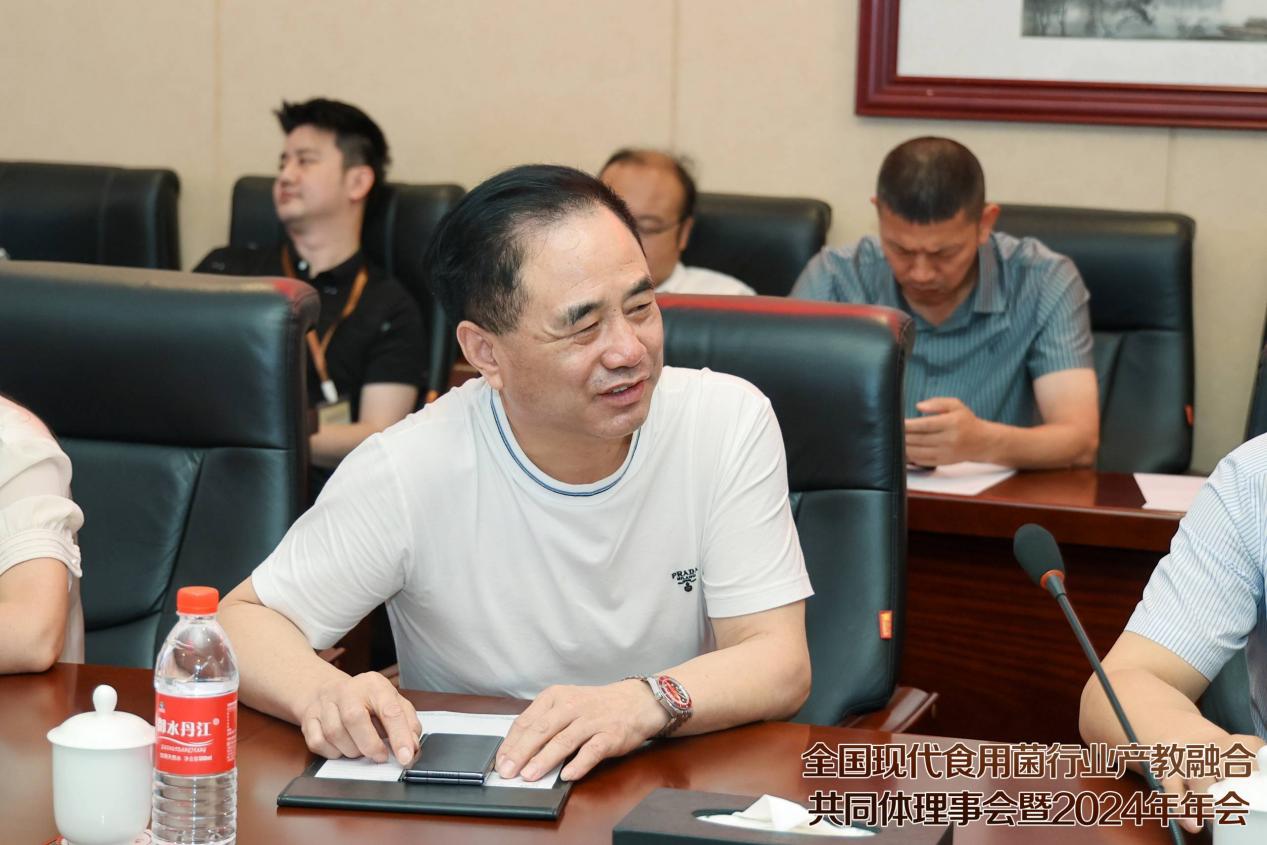 湖北裕国菇业股份有限公司董事长雷于国作为企业代表发言,雷于国董事长介绍了公司的基本情况以及在产教融合方面取得的可喜成绩。他表示,湖北裕国菇业股份有限公司发展至今,科技创新扮演了很重要的位置,公司将持续践行产教融合共同发展,从科技创新的土壤中汲取营养,助力食用菌产业健康发展。他指出,香菇产业从当初的初级农产品,发展到现在集生物技术、精深加工、智能装备等多领域于一身的高端产业,作为随州新质生产力典型代表,离不开科技创新的助力,更离不开领导们的大力支持。相信在产教融合共同体的不懈努力下,随州香菇定将再创佳绩。