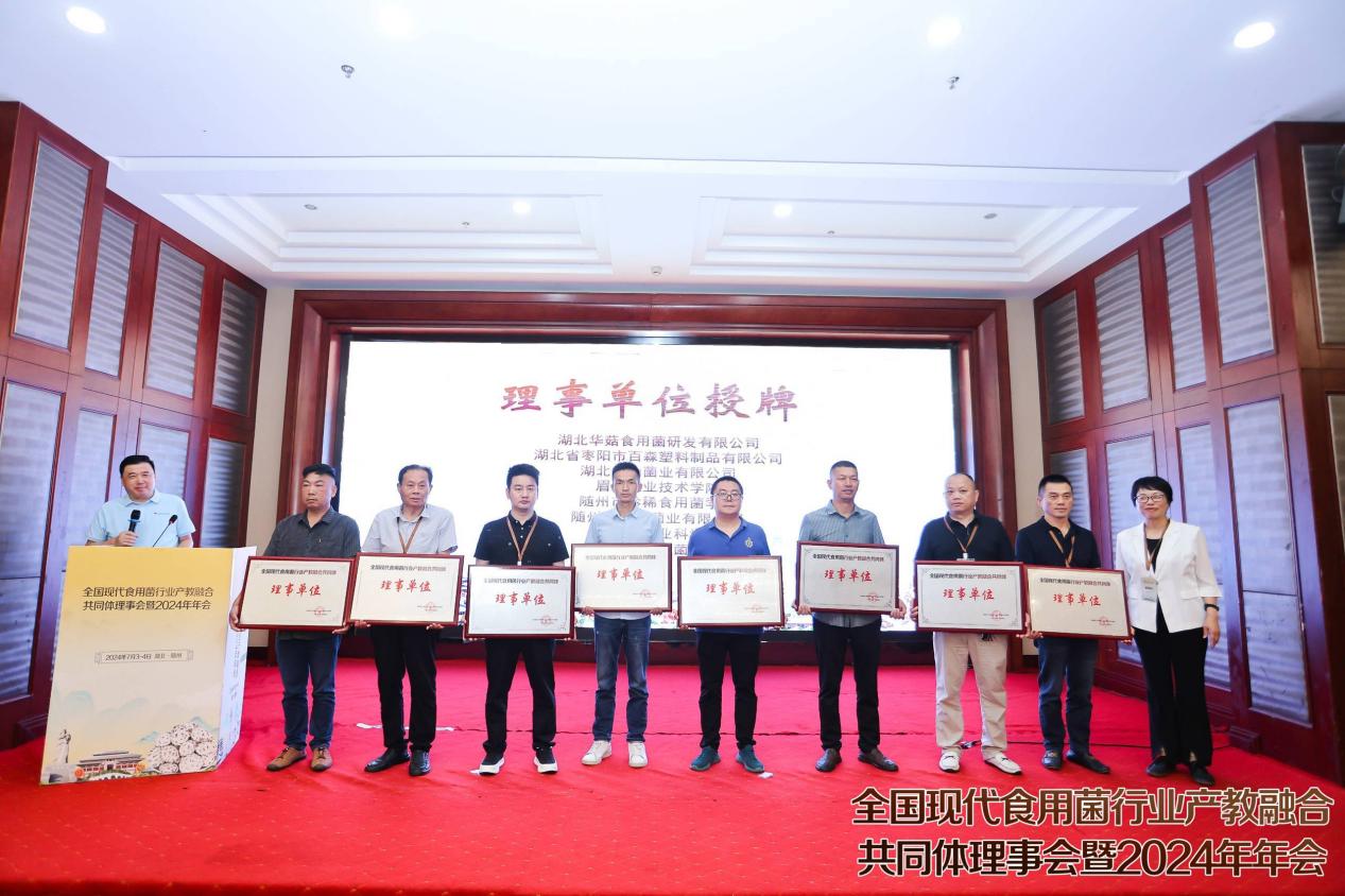 开幕式结束后,随即开始了全国现代食用菌产业产教融合共同体全体大会。首先由随州职业技术学院香菇学院党支部书记吴冉冉宣读《共同体章程(讨论稿)》,讨论稿以举手表决的形式审议通过。然后以举手表决的形式通过了理事长单位名单、副理事长单位名单、理事单位名单,并现场进行了授牌。大会通过湖北裕国菇业股份有限公司、品源(随州)现代农业发展有限公司、华中农业大学、随州职业技术学院共4家理事长单位,通过包括易菇网在内的12家副理事长单位,16家理事单位。此外还有多家会员单位,会员单位可作为理事单位候选,申请理事单位,于下届理事会时进行审议。