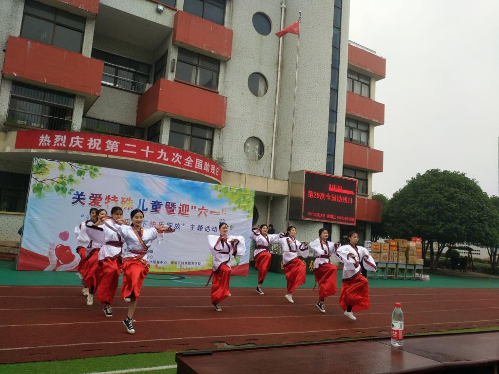 上午800全体志愿者到达特殊教育学校参与由曾都区残联等主办级“关爱特殊儿童让花朵在阳关下快乐绽放”全国第二十九个助残日活动。服装与艺术设计学院志愿者通过歌舞给所有的残障儿童带来快乐。由刘芳等同学带来的舞蹈《礼仪之邦》、陈柳卉等同学带来的歌曲《让世界充满爱》、陶玉霞等同学带来的舞蹈《我们都是追梦人》为这群特殊的孩子带来美好的祝福,给他们带去关爱。