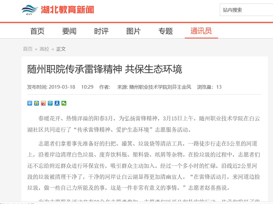 下一条:湖北高校思政网:随州职业技术学院传承雷锋精神 爱护生态环境